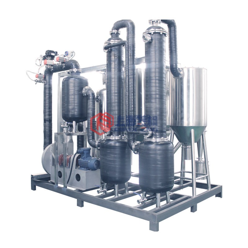 從干燥塔底部排出的氣體中含有粉料和有機(jī)溶劑蒸汽,采用過濾裝置進(jìn)行回收,將粉料和有機(jī)溶劑氣體進(jìn)行分離,粉料回收,有機(jī)氣體進(jìn)入冷凝器進(jìn)行回收并重復(fù)利用。