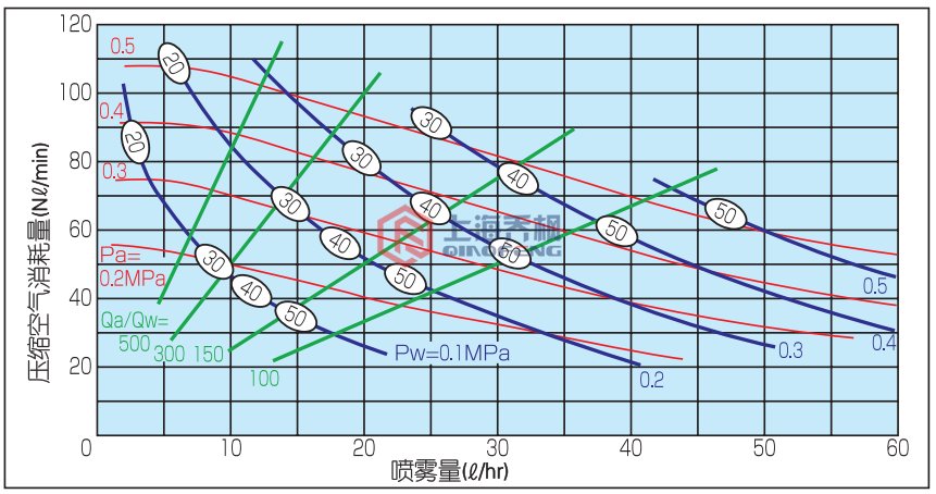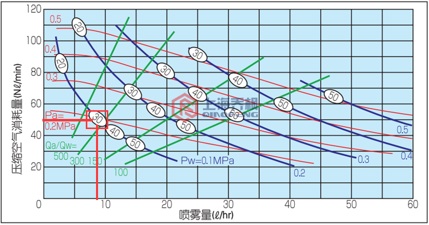 如需其他尺寸粒徑的霧滴,先確定處理量,做一條豎向軸,找到大致粒徑大小,然后找到交點(diǎn),找出壓縮空氣壓力。