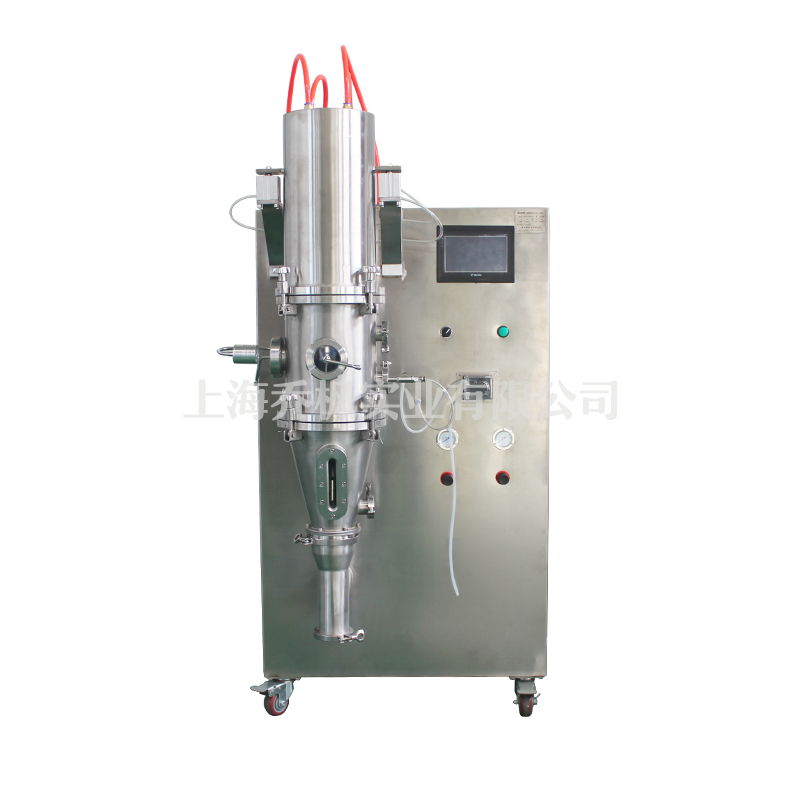 1)多功能噴霧造粒機操作方便:控制系統采用PLC自動控制,彩色觸摸屏操作,實驗過程中實驗參數如進風溫度,出風溫度,物料溫度,風機轉速,噴霧壓力等可以根據實驗需要即時更改,方便用戶使用;觸摸屏帶USB接口,數據可導出至U盤或在線打印;